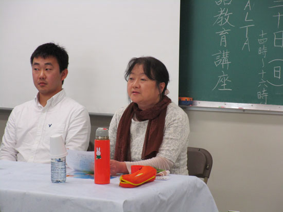 会場には日本語を学ぶ子供、保護者、日本語教師など46人が訪れた。司会進行も務めたJALTA会長の馬目広三さんによる開会の挨拶の後、3人のゲストスピーカーがそれぞれ講演した。